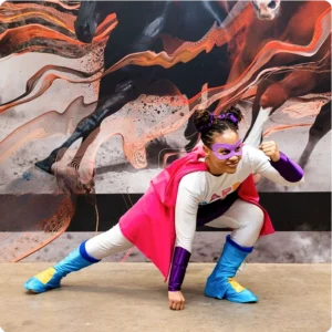 An illustration of our Healthy Smile Hero, wearing a pink cape, purple mask and skirt, and holding a dental floss lasso.