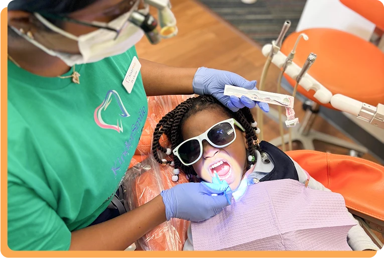 The family returned to KinderSmile. Staff tried again with sweet, nervous Amelia, and despite some tears, the team was able to treat her first tooth!