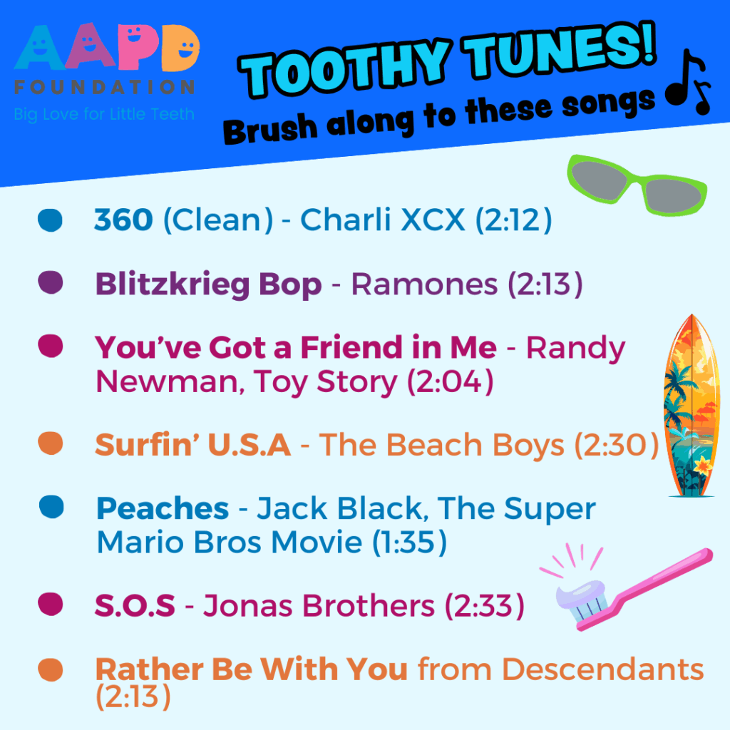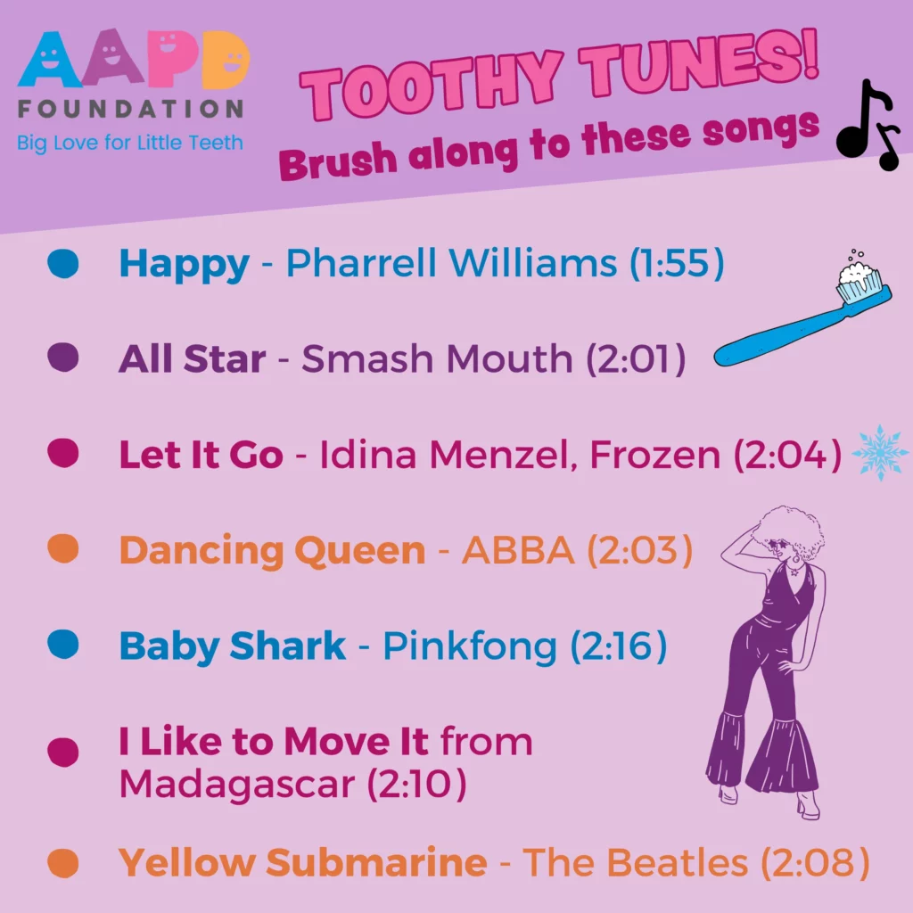 Dentists recommend brushing for 2 minutes, twice daily. Make it fun with these kid-friendly tunes – each song is the perfect length for a thorough brush. #ParentingTips #HealthySmiles #ToothyTunes