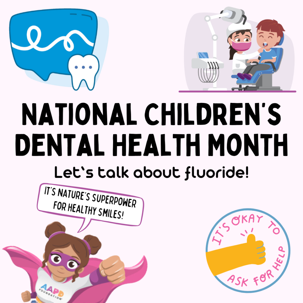It’s National Children’s Dental Health Month! To celebrate, let’s talk FLUORIDE. Fluoride strengthens tooth enamel, fights cavity-causing bacteria, and helps prevent tooth decay. It’s like a protective shield for kids’ teeth, rebuilding and remineralizing them before damage happens. It is a handy tool in a healthy smile hero’s belt!