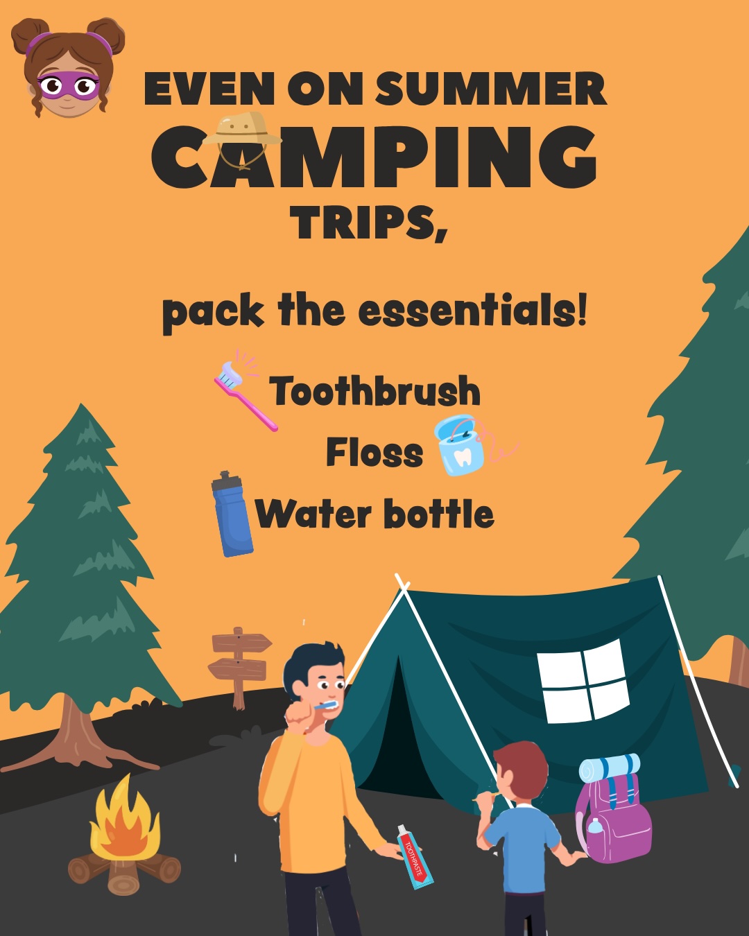 Out in the wild doesn’t mean out of oral care! Even on camping trips or sleepovers, pack the essentials: