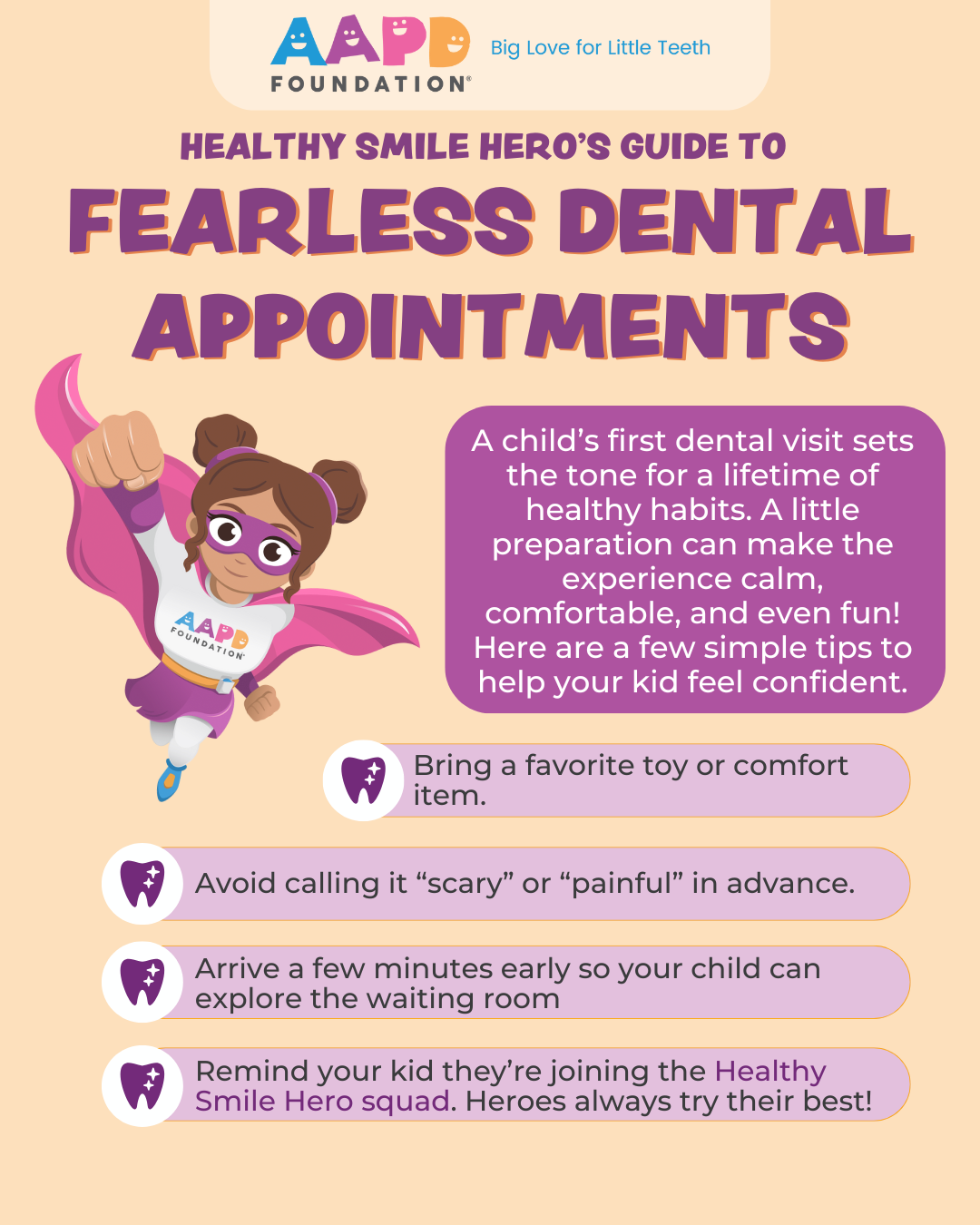 Help your kid be a brave Healthy Smile Hero at the dentist. 🦷 A little prep goes a long way in building confidence, comfort, and a healthy smile. Save this checklist for later. #ParentingTips